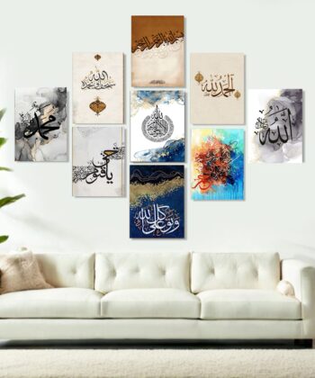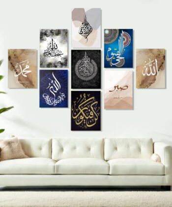 Set of 9 premium 8x11-inch wooden frames featuring high-definition Islamic calligraphy and superior quality finishing.