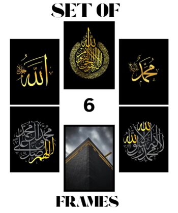 Set of 6 premium MDF wood frames featuring a stylish mix of two 8x11 and four 5x7-inch Islamic calligraphy designs.