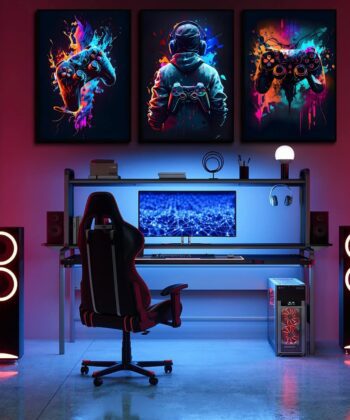 Set of 3 retro gaming wall posters (8x11-inch) featuring vibrant neon and cyberpunk-style watercolor designs, perfect for any gamer's room.