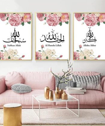 Set of 3 premium 8x11-inch Islamic wall frames featuring Pink Peony floral art and high-definition black-and-white calligraphy.