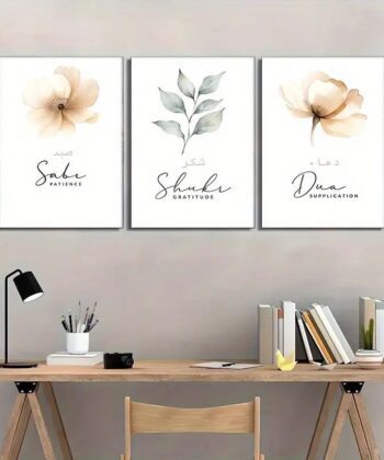 Infuse your space with spiritual beauty using this 3-piece Sabr, Shukr, and Dua botanical art set, featuring durable 8x11 inch MDF wooden tiles. Designed for easy, nail-free mounting with included double tape, these lightweight frames offer a modern and meaningful decor solution for any home or office.