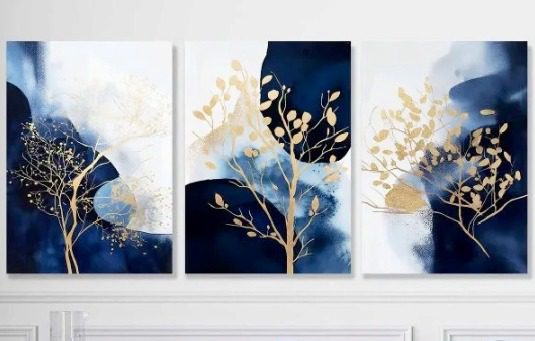 Elevate your home aesthetics with this sophisticated 3-piece abstract wall art set, featuring a stunning blend of deep blue and shimmering gold tones. Each 8×11 inch frame is crafted from premium wooden sticky tiles, offering a high-end canvas-like texture with a sleek, modern finish. The set comes with industrial-strength adhesive tape, allowing you to create a professional gallery wall in minutes without using nails or damaging your surfaces. Perfect for living rooms, bedrooms, or modern office spaces, these minimalist frames add a touch of luxury and creative flair to any