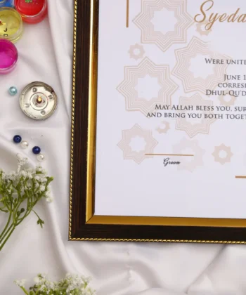 Buy our Premium Nikkah Contract, a Personalized, Digital, and Printable Nikkah Certificate, featuring Mate Finishing and Elegant Vivid Colors in an 8x12 inch acrylic frame. Use our easy custom design tool to personalize your Islamic Wedding Contract and cherish this bespoke Nikkah Nama forever!